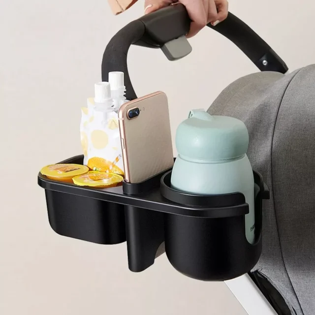 This multifunctional accessory is built to hold a variety of items securely. The adjustable cup holder fits everything from coffee cups and water bottles to baby bottles, preventing spills with a firm grip. Your phone stays safe and accessible in the dedicated holder, so you can easily answer calls, listen to music, or snap photos without holding it in your hand. The built-in snack tray adds even more versatility by storing small treats for you or your child during walks, errands, or downtime.