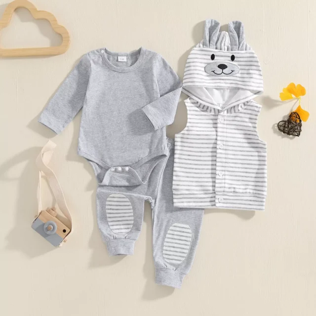 Dress your little one in irresistible charm with this 3-piece baby boy fall bear outfit. Designed for everyday wear and special outings, this set includes a solid long-sleeve romper, elastic waist pants, and a striped sleeveless hooded jacket featuring a playful bear theme. The combination of soft fabrics and thoughtful design ensures your baby stays comfy, stylish, and photo-ready all day long.