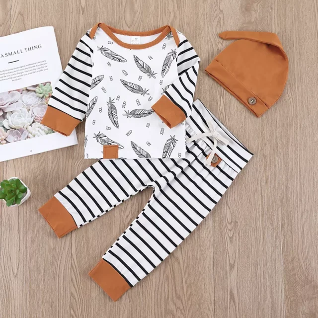 The classic striped pattern is paired with an eye-catching feather print, adding a playful and trendy touch. The pullover design makes dressing hassle-free, and the O-neck collar ensures comfort around your baby’s neck. This set includes coordinating pants and a matching hat, creating a complete look without the need for extra styling. The fabric is breathable yet warm enough for cooler days, making it a versatile choice for any occasion.