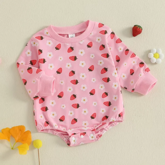 Dress your little one in charm and comfort with this baby girl romper, designed with a sweet strawberry and flower print that makes every day brighter. With its long sleeves and soft crew neck, this romper is perfect for keeping your baby cozy while still looking stylish. Whether it’s for lounging at home, visiting family, or casual outings, this outfit ensures your baby girl feels comfortable and looks absolutely adorable.