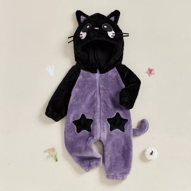 Unlike ordinary baby rompers, this hooded jumpsuit combines practicality with playful style. The black cat design adds fun personality, while the warm material makes it a must-have staple for cooler seasons. Available in sizes from 3 to 24 months, it’s designed to grow with your little one through those precious first years.
