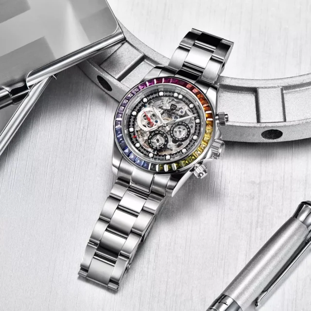 Step into a world of elegance and precision with our Luxury Mechanical Automatic Watch. Designed for the modern man, this exquisite timepiece features a striking rainbow ceramic bezel that adds a touch of vibrant sophistication to your style. Whether you’re in a professional setting or off to a casual outing, this watch ensures you’ll always present yourself with confidence and class.