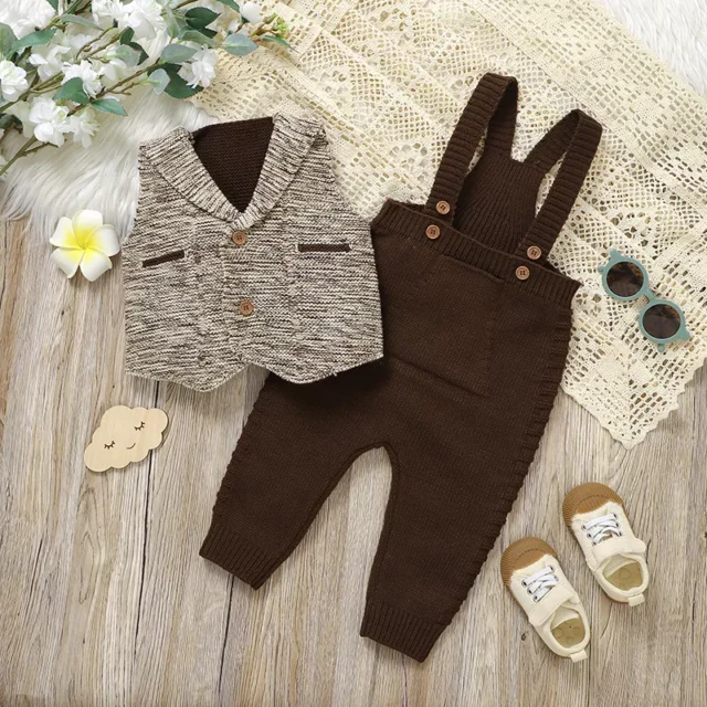 Dress your baby boy in timeless elegance with this adorable 2-piece knit formal outfit. Featuring a cozy sleeveless sweater vest and matching jumpsuit, this set is designed to make your little one look like a true gentleman from the very first wear. Crafted from soft acrylic worsted knit, it offers both comfort and style for babies from newborn up to 18 months. With its solid pattern, V-neck collar, and single-breasted closure, this outfit delivers a refined look that is perfect for every season and any special occasion.