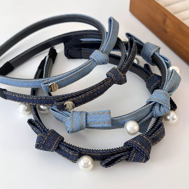 Retro Denim Blue Bow Pearl Headband – Women’s Chic Fashion Hair Accessory