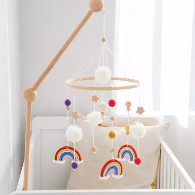 Transform your baby’s crib into a world of gentle music, soft colors, and delightful motion with this beautifully crafted Wooden Baby Crib Mobile. Designed for newborns up to toddlers, this mobile features charming crochet rainbow elements, soothing melodies, and a gentle projection light that turns bedtime into a magical experience. Made with safe, high-quality materials, it’s the perfect combination of entertainment and developmental support for your little one.