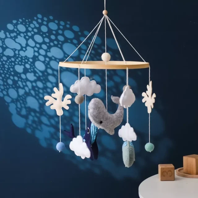 Transform your baby’s nursery into a serene ocean paradise with this charming Wooden Baby Crib Mobile. Featuring soft felt whales, scallops, and clouds, this mobile is more than just decoration — it’s a soothing companion that captures your little one’s attention and sparks their imagination. With its gentle motion and adorable marine designs, it’s perfect for helping babies relax before sleep or keeping them engaged during playtime.